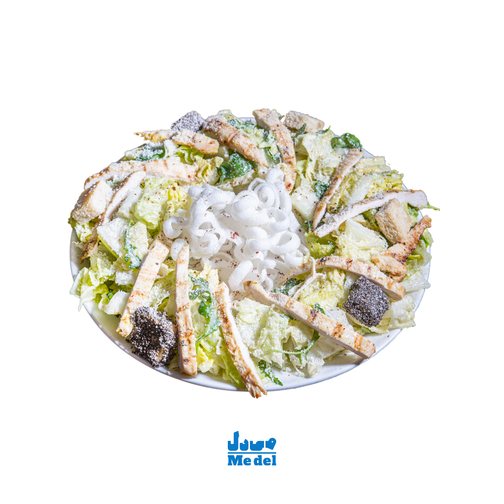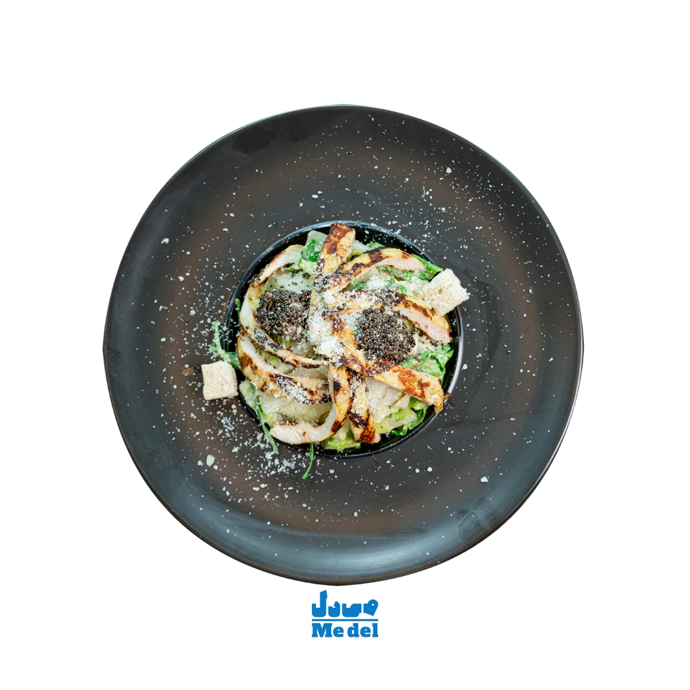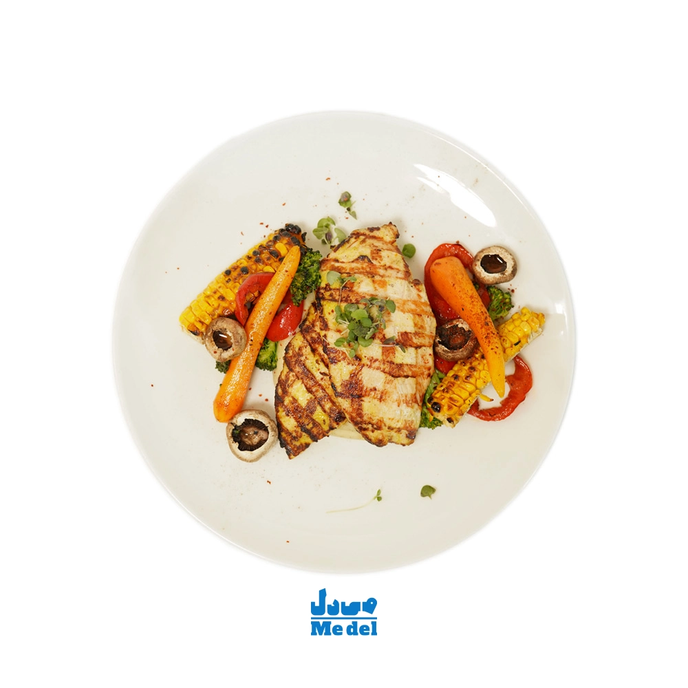 سینه مرغ گریل، میکس سبزیجات تازه و پنیرپارمژان، سس سزارمی دل
