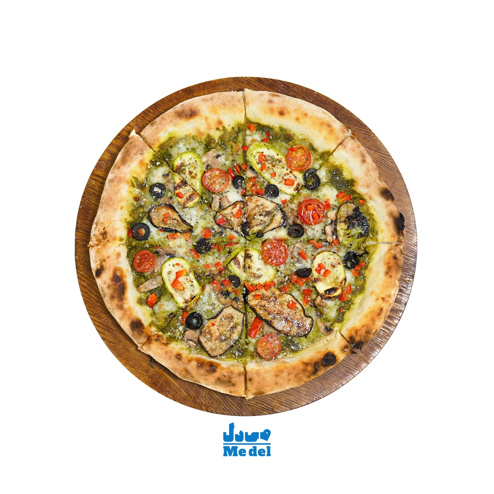 سبزیجات گریل، زیتون، موتزارلا، سس پستو