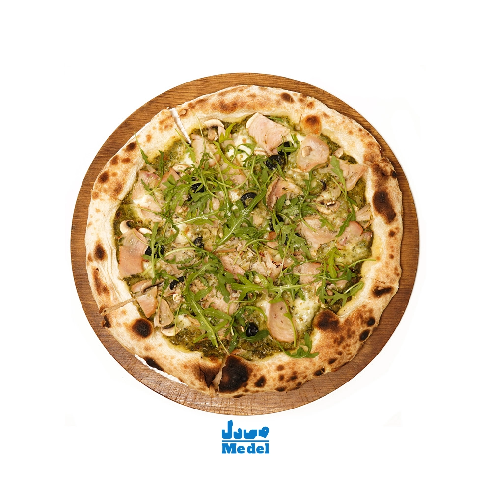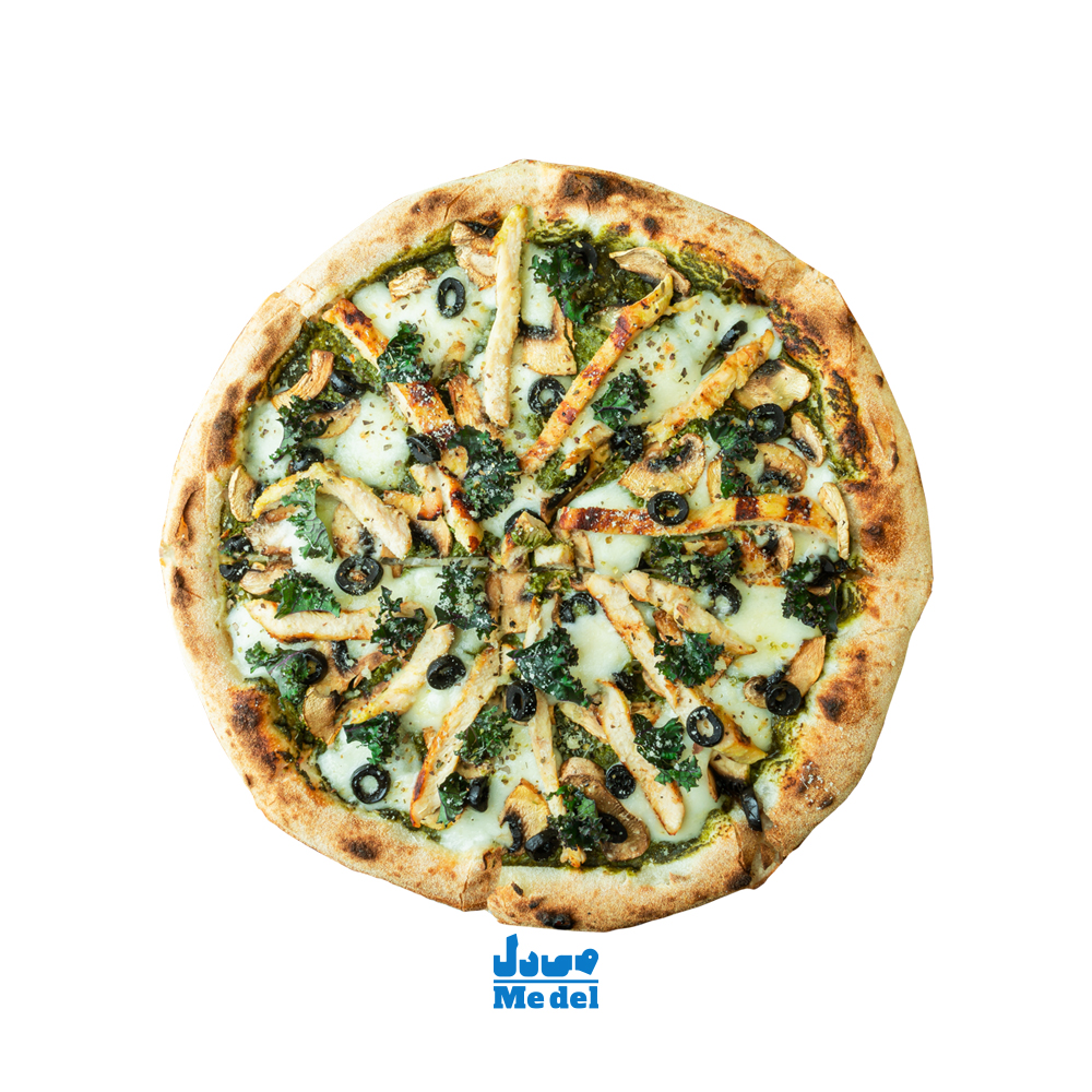 مرغ گریل، سس پستو، قارچ، کیل بنفش، زیتون، پنیر موتزارلا