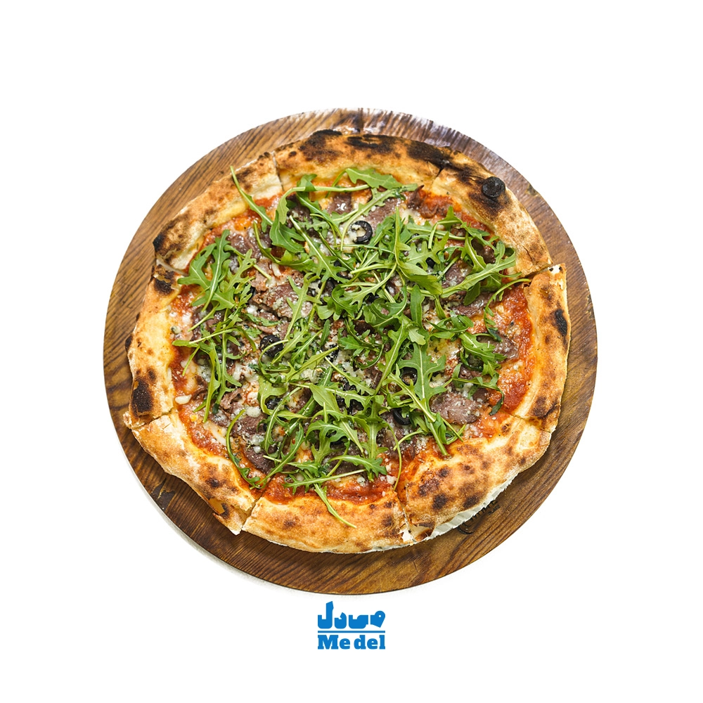 استیک گوساله، پنیر بلوچیز، روکولا، قارچ، زیتون، سس سیر و مارینارا