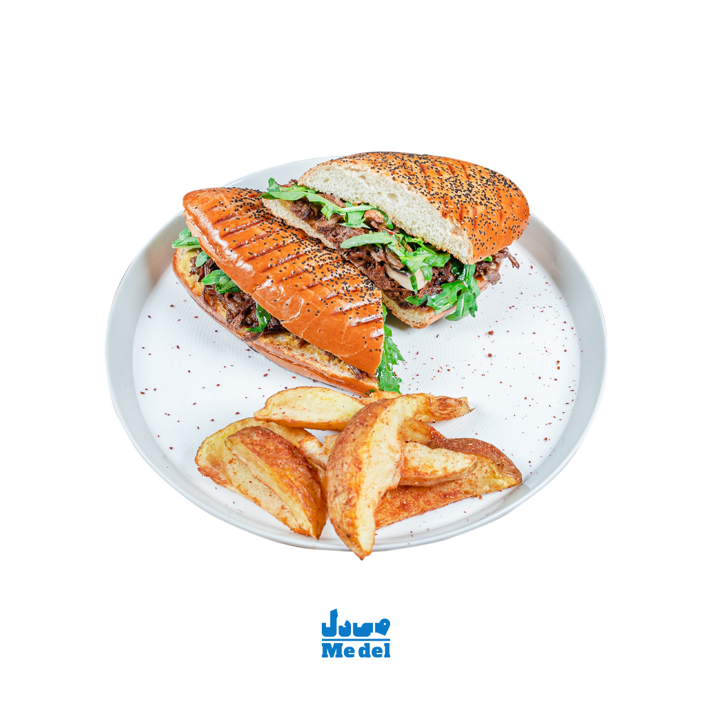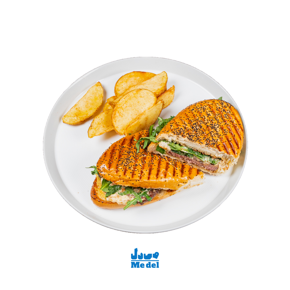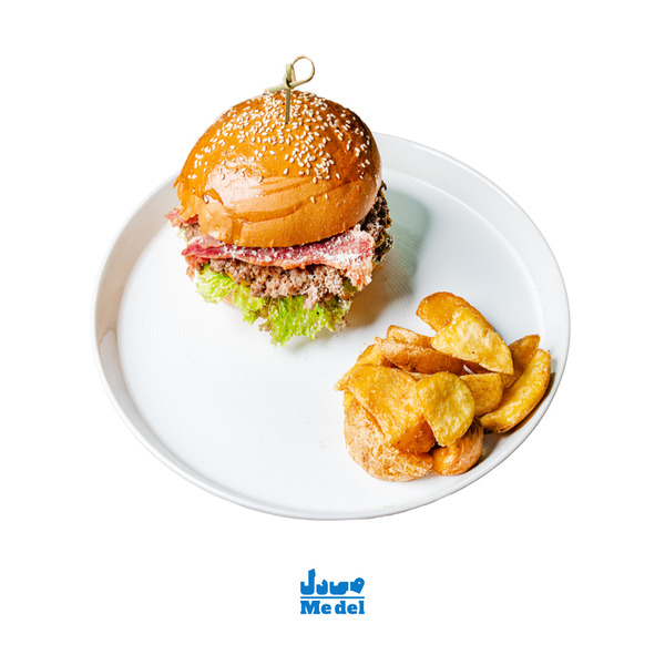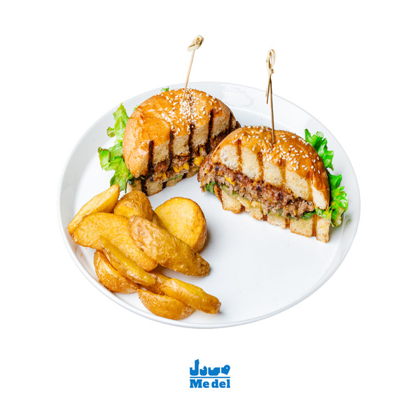 دو عدد برگر۶۰ گرمی، خیارشور،پنیرچدار،پنیرپارمزان،کاهو،بیکن گوساله،نان مخصوص میدل