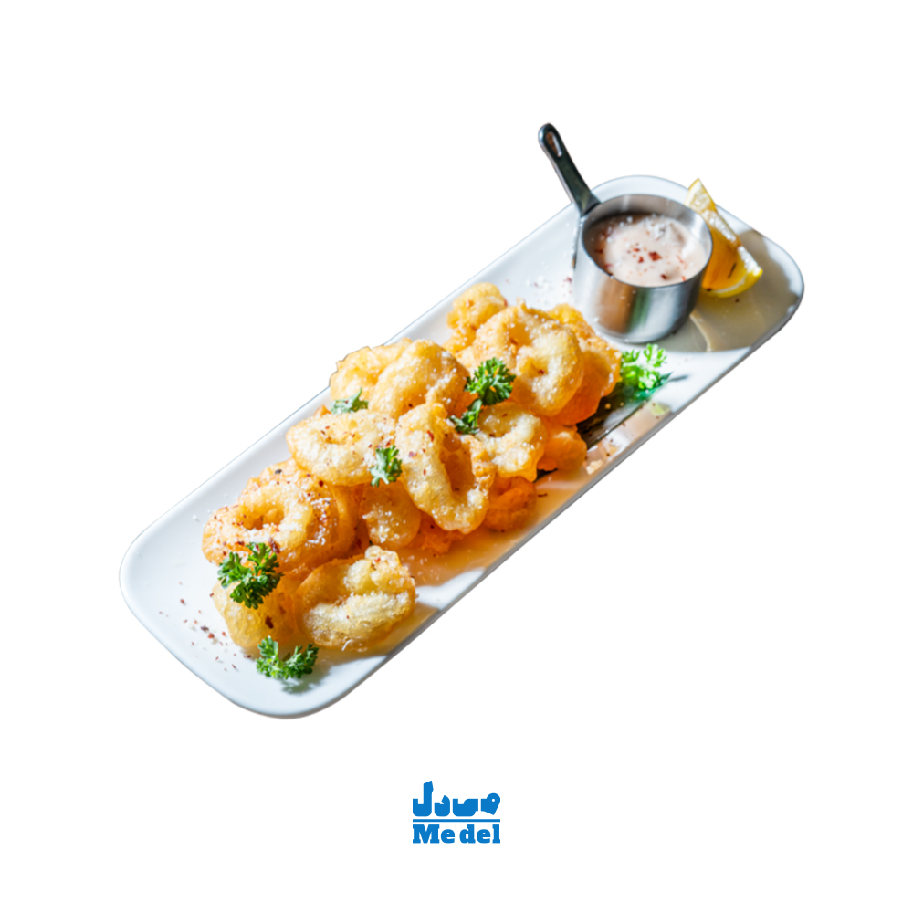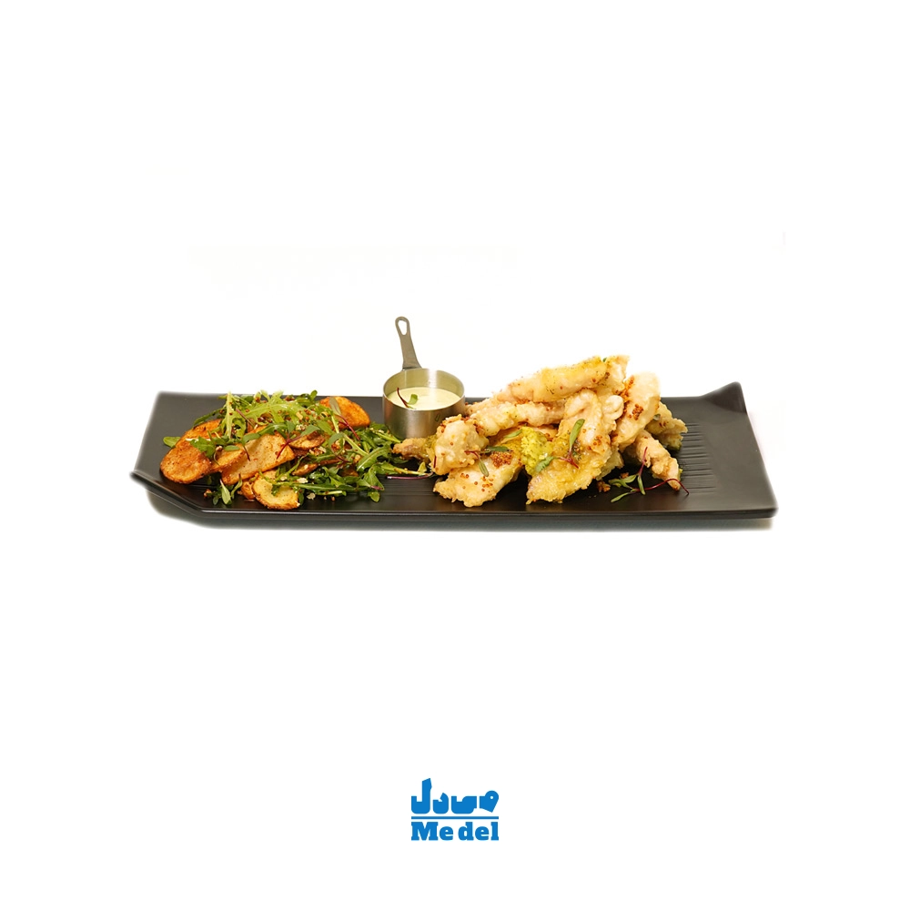 فیله ماهی کفشک تمپورا به همراه چیپس سیب زمینی و سالاد روکولا