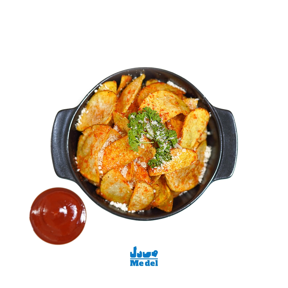 سینه مرغ تمپوره شده، سیب زمینی سرخ شده، سالاد روکولا