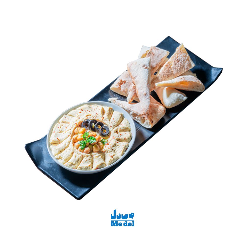جگر گوساله ، پاپریکا، روغن زیتون به همراه سالاد پیاز قرمز، گوجه فرنگی و روکولا همراه با نان تازه می دل