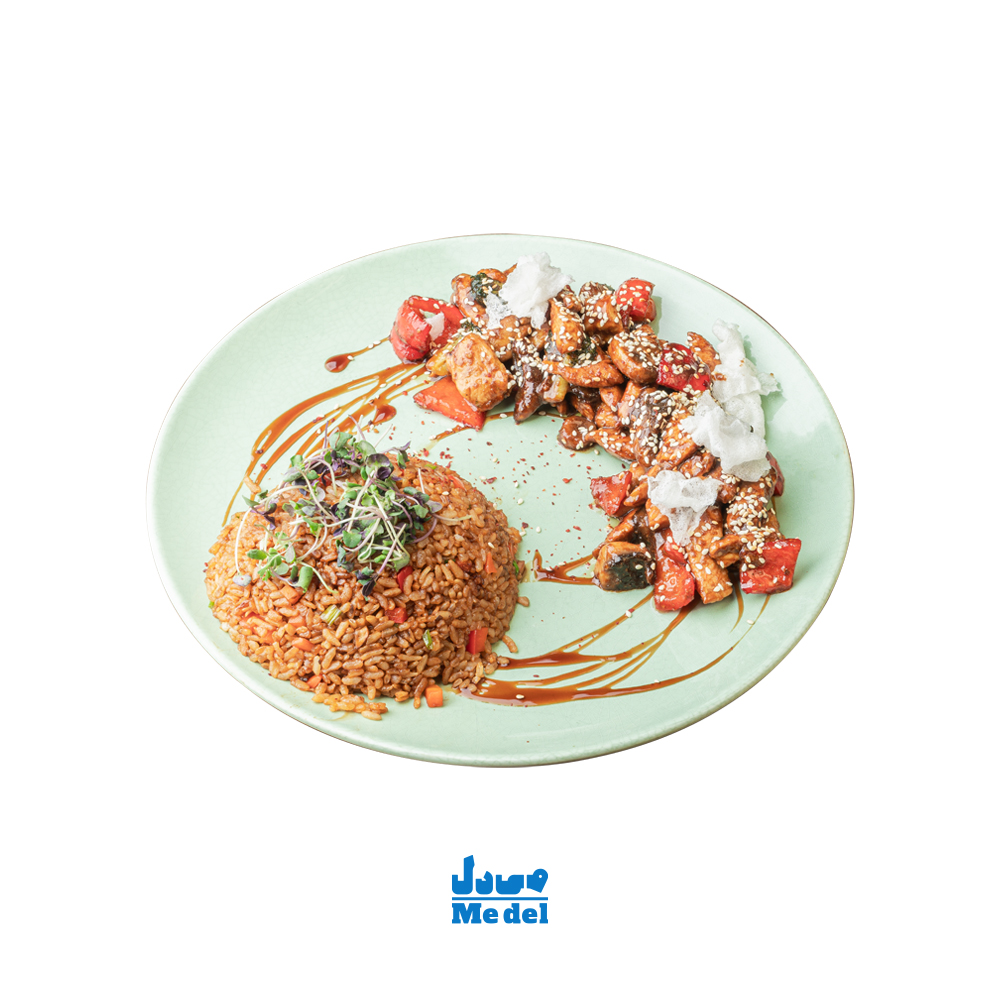 سینه مرغ، برنج ژاپنی مزه دار شده با سس سویا و سبزیجات قارچ، فلفل دلمه ای، هویج، پیازچه همراه با سبزیجات تازه