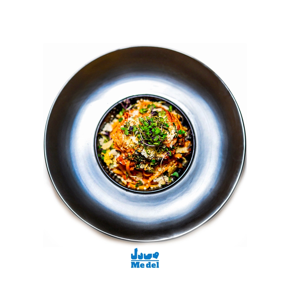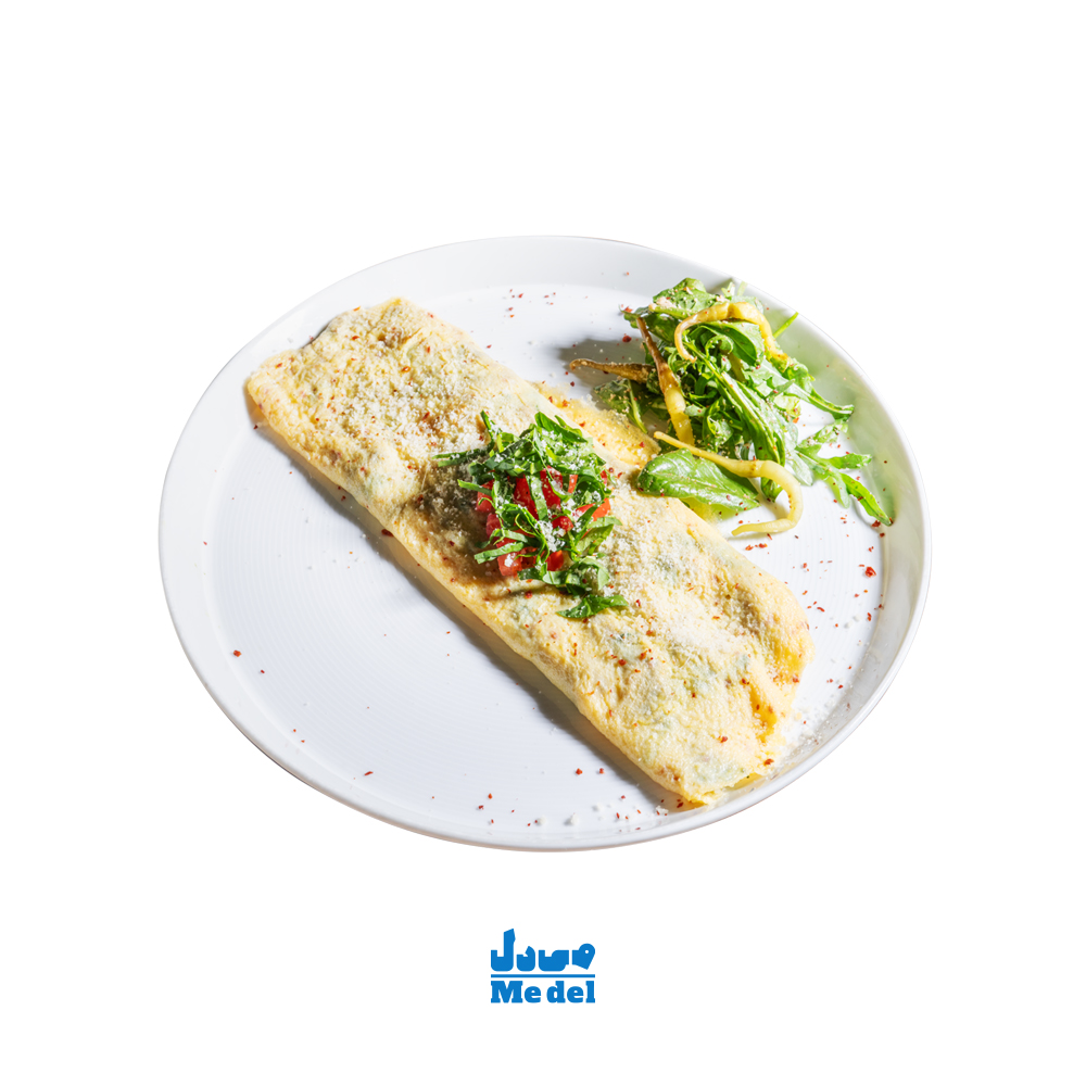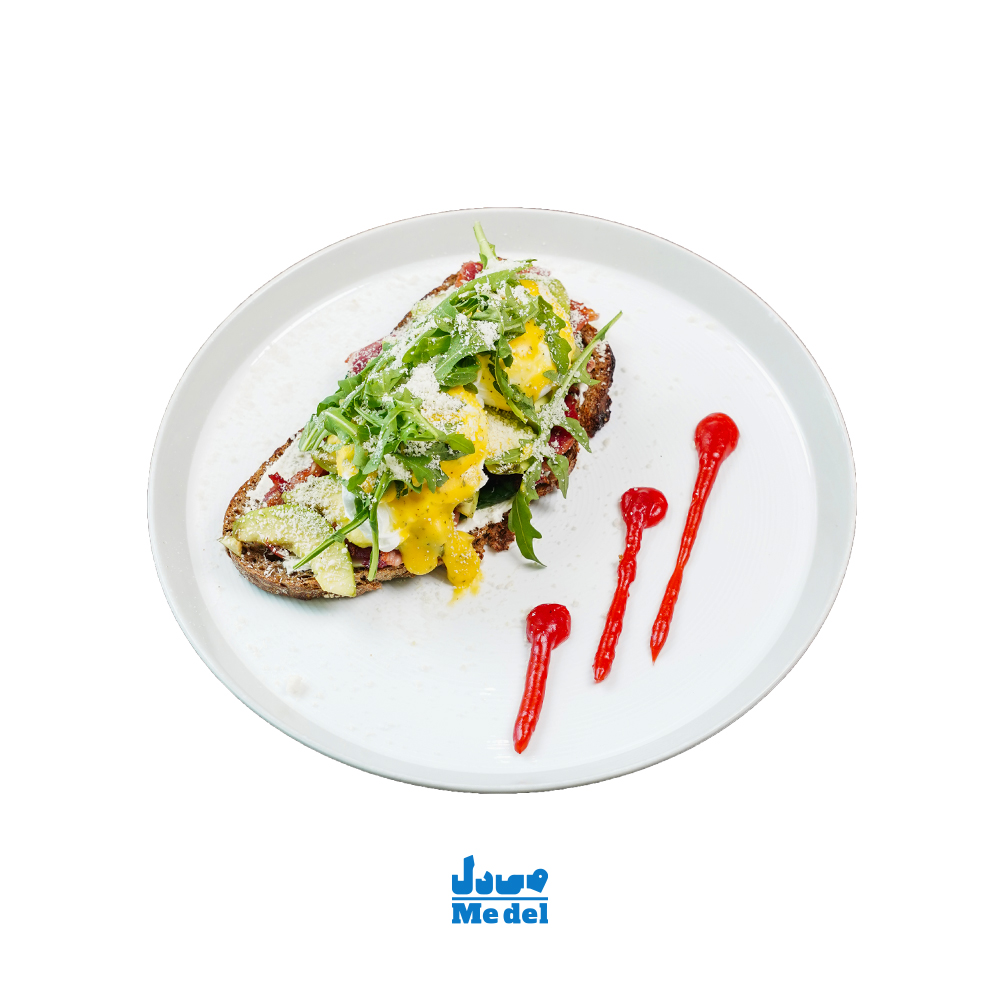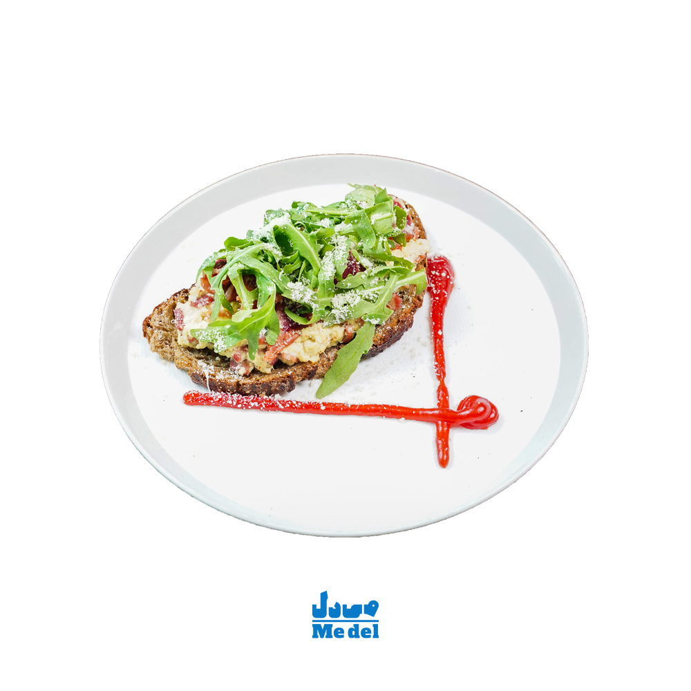 گوشت گوساله، قارچ کاراملی، روکولا، سس مخصوص