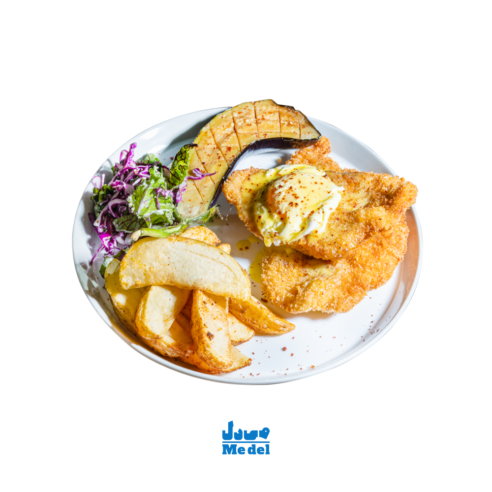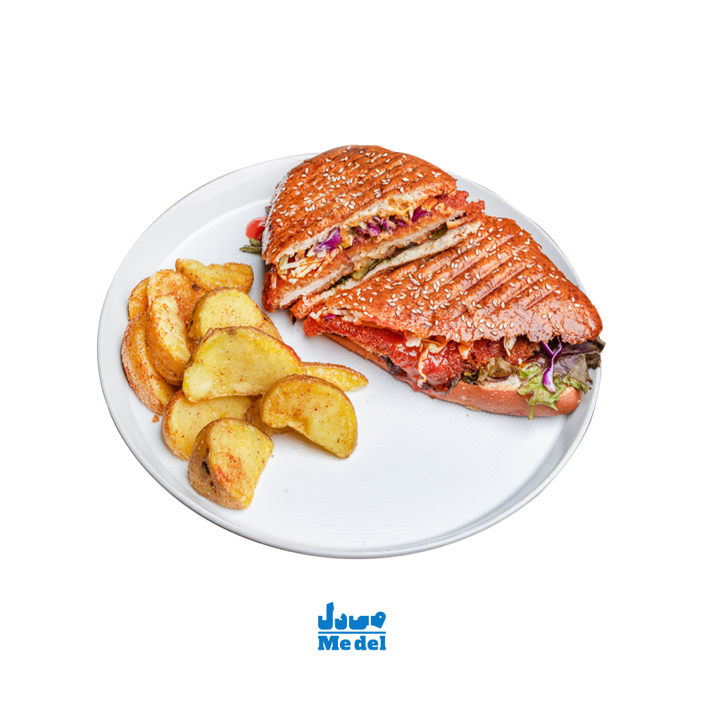 شنیسل سینه مرغ، کاهو، خیار شور،سالاد مخصوص، سس بوفالو