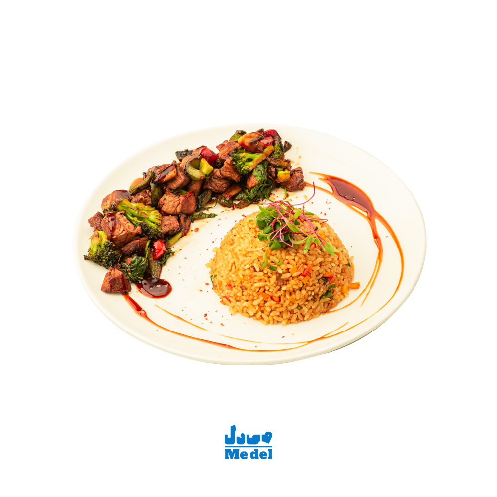 فیله استیک، برنج ژاپنی مزه دار شده با سس سویا و سبزیجات بروکلی، ریحان ایتالیایی، جوانه ماش، پیازچه