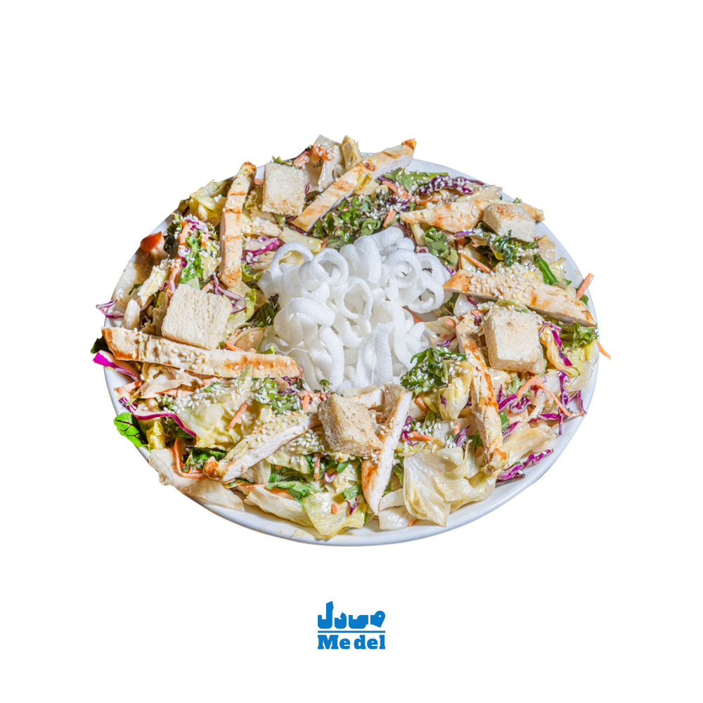 سینه مرغ گریل ، سبزیجات تازه ، سس کره بادام زمینی ، سویا سس، نودل سرخ شده