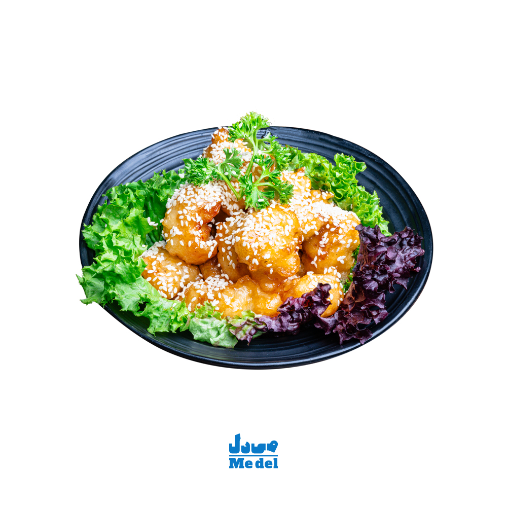سینه مرغ کیوب تمپورا شده به همراه سس پرتقال
