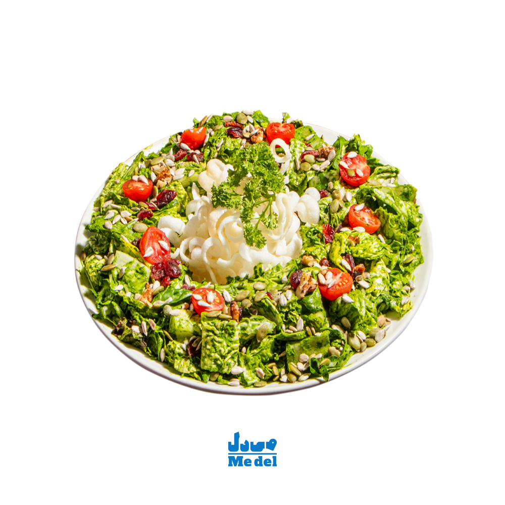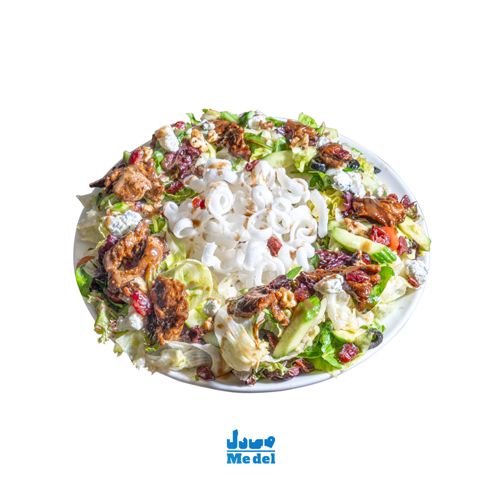 میکس اسفناج ، روکولا ، کاهورسمی ، کاهو فرانسه, گوجه فرنگی ، گردو کاراملایز، کرنبری ، سس سبز و بالزامیک