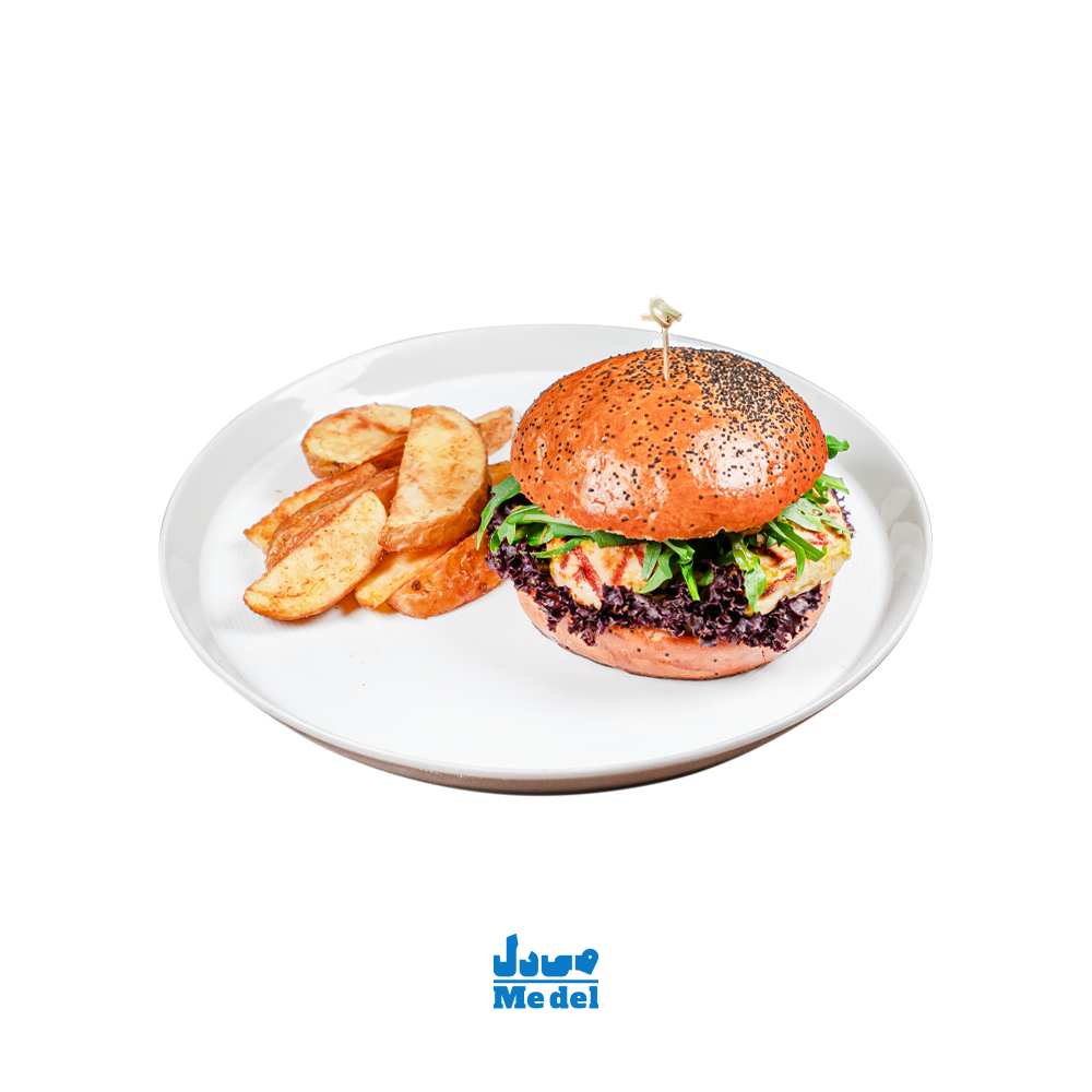 ۳ عدد برگر ۶۰ گرمی،۳عدد پنیر چدار، خیار شور، گوجه، کاهو، نان مخصوص میدل