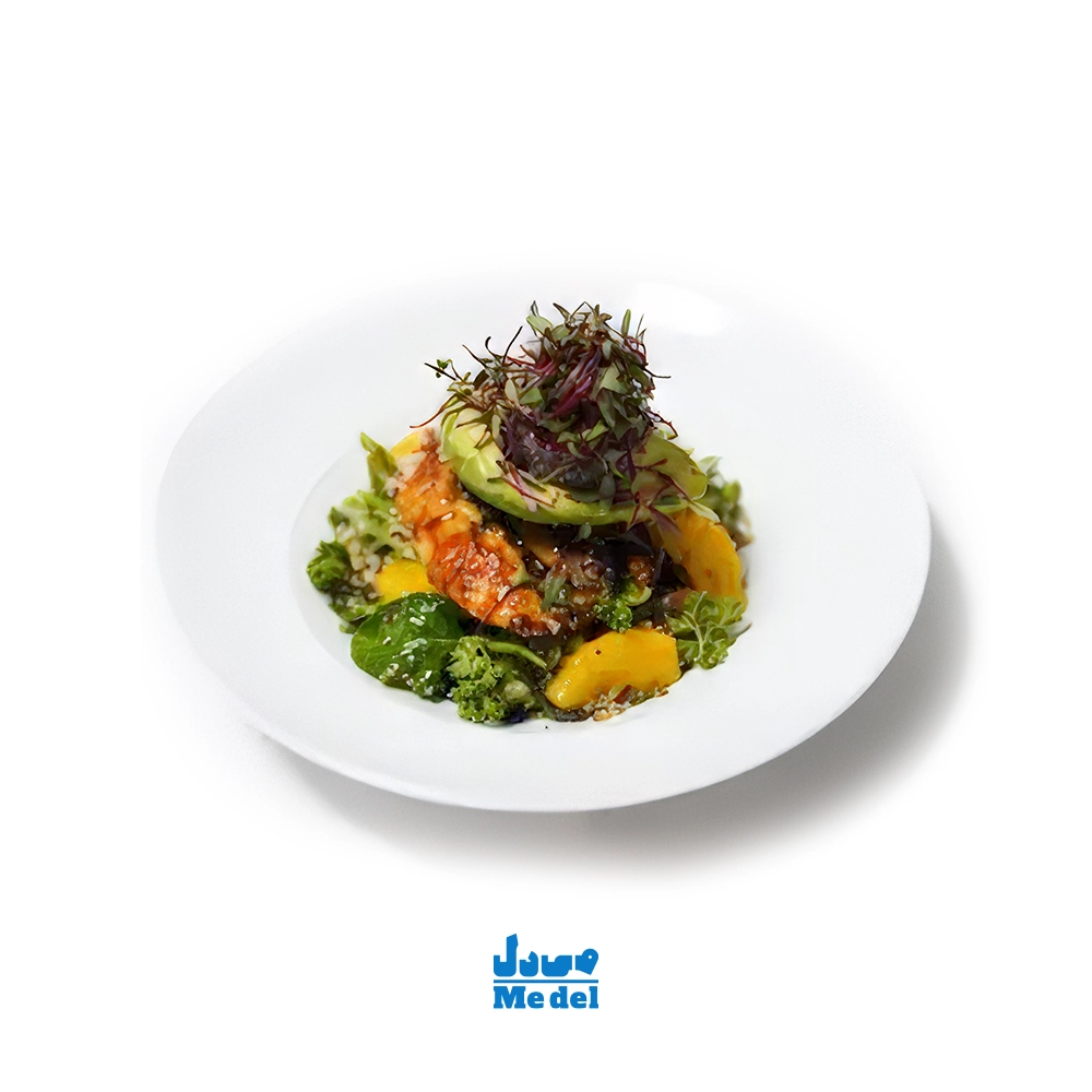 آووکادو، سبزیجات تازه، کینوا، سس پرتقال، عسل، فیله مرغ پن فراید