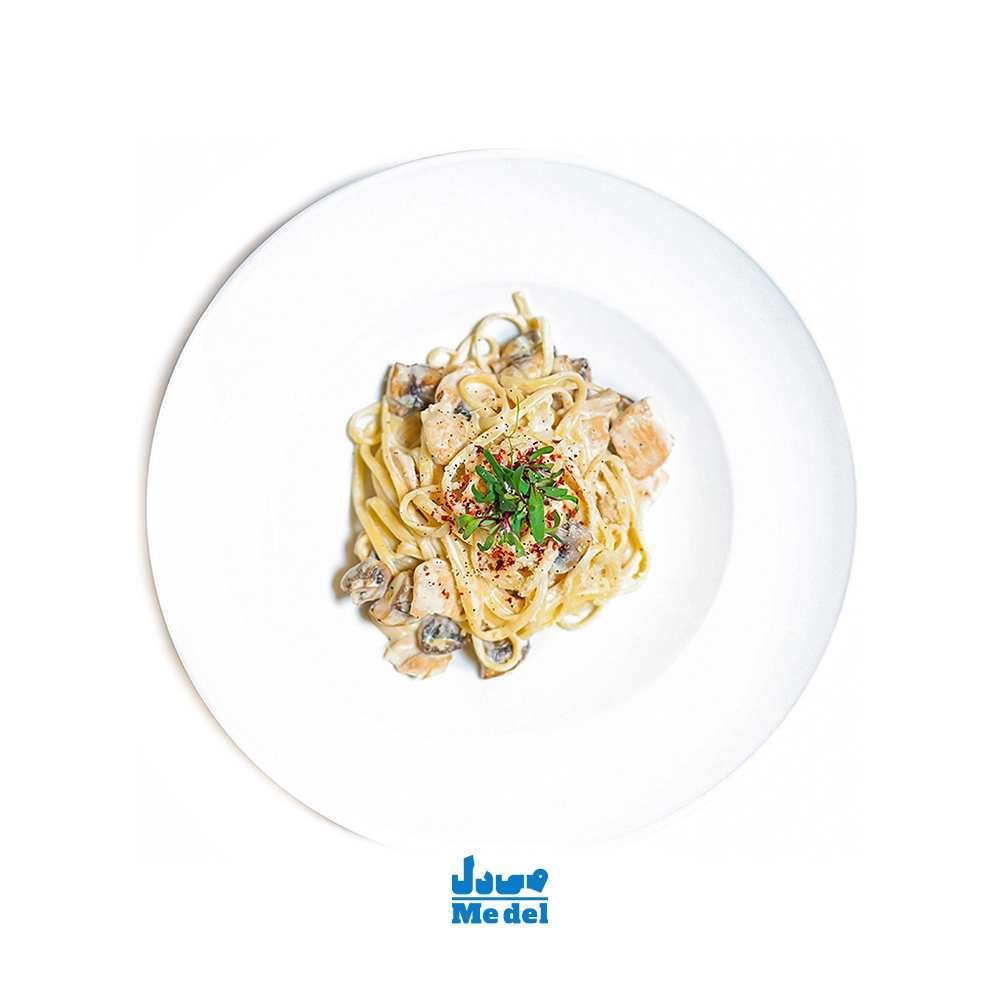 لینگوینی به همراه مرغ رست شده، پنیر پارمزان، قارچ و سس آلفردو